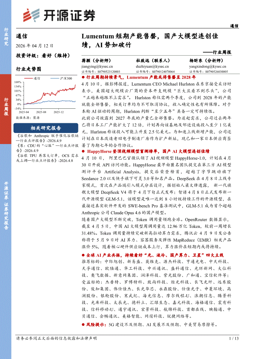 通信行业:开源证券-通信行业周报:Lumentum短期产能售罄,国产大模型连创佳绩,AI势如破竹-260412