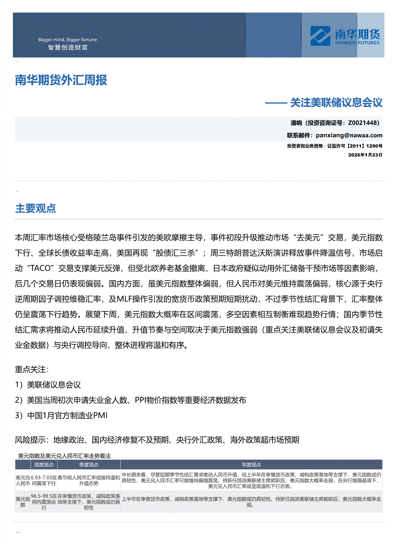 南华期货-外汇周报:关注美联储议息会议-260123