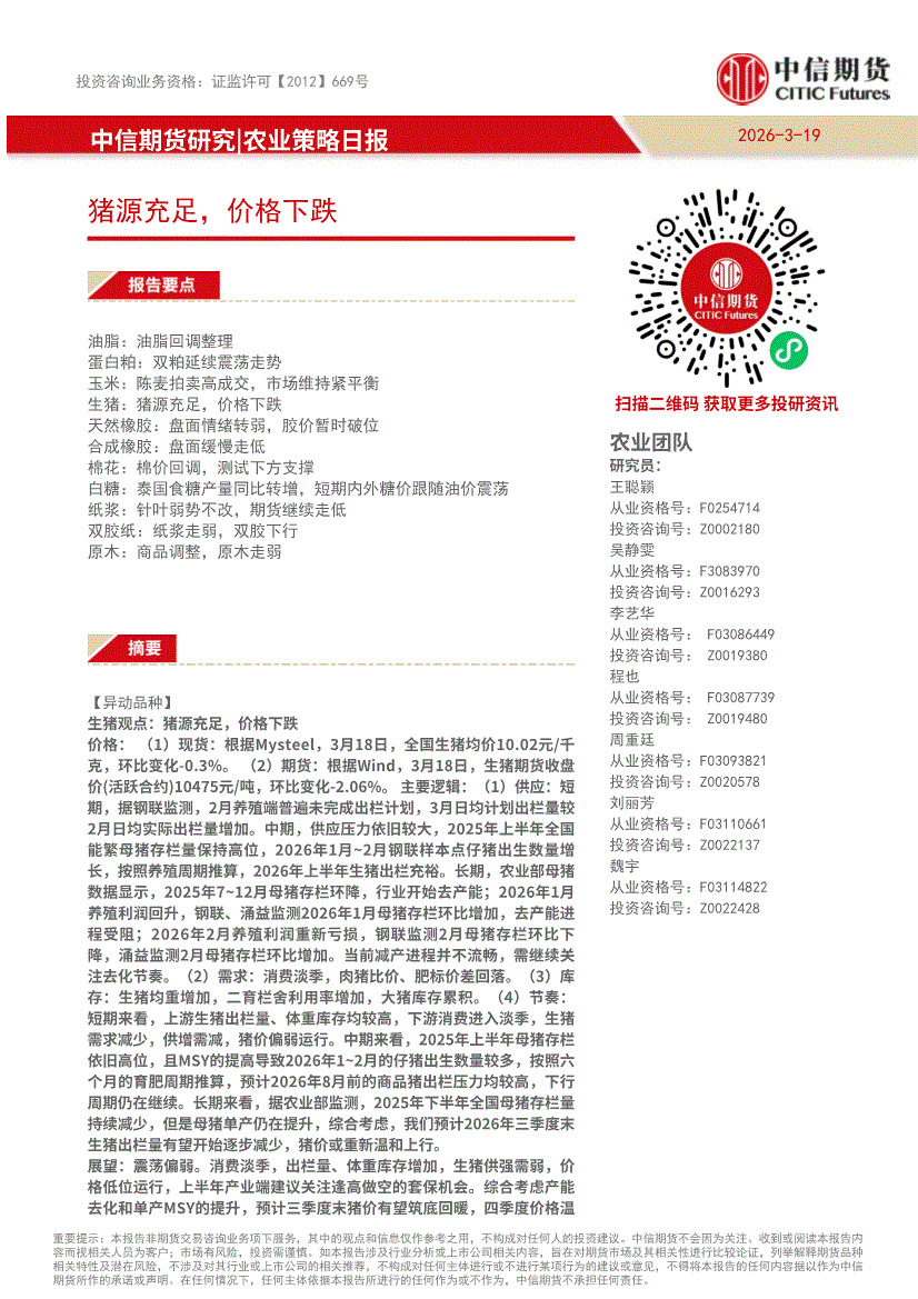 中信期货-农业策略日报:猪源充足,价格下跌-260319