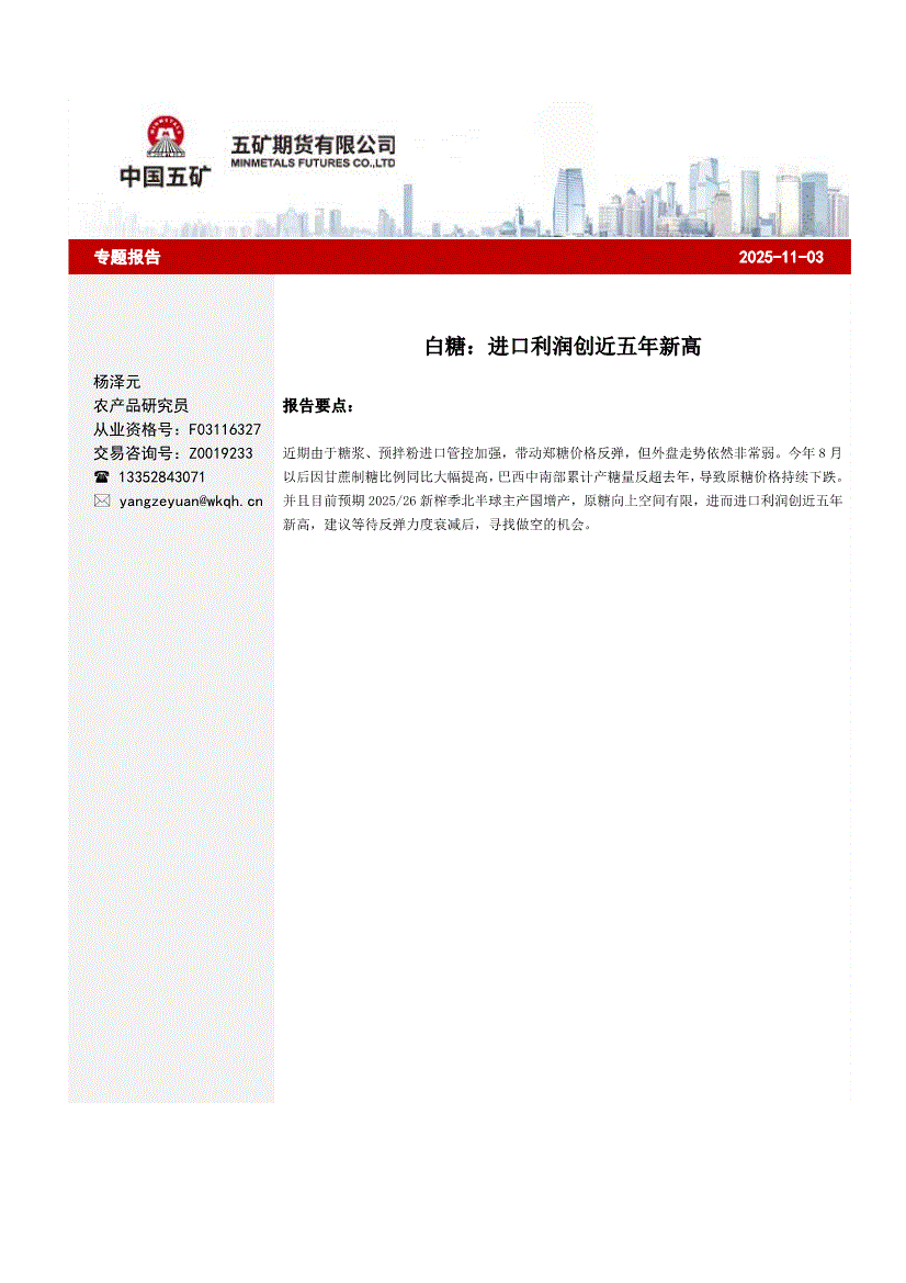 五矿期货-白糖:进口利润创近五年新高-251103
