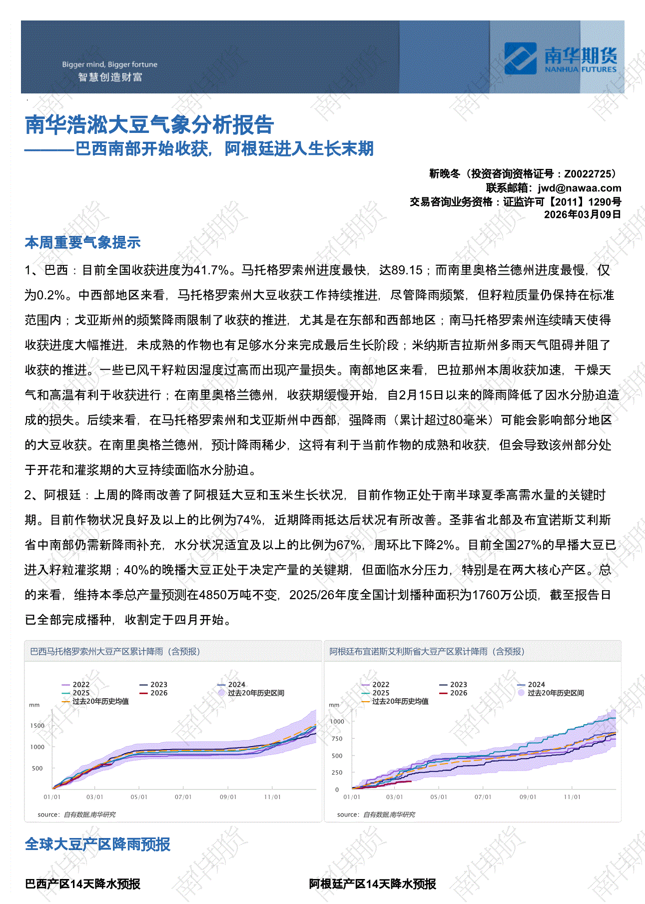 南华期货-浩淞大豆气象分析报告:巴西南部开始收获,阿根廷进入生长末期-260309