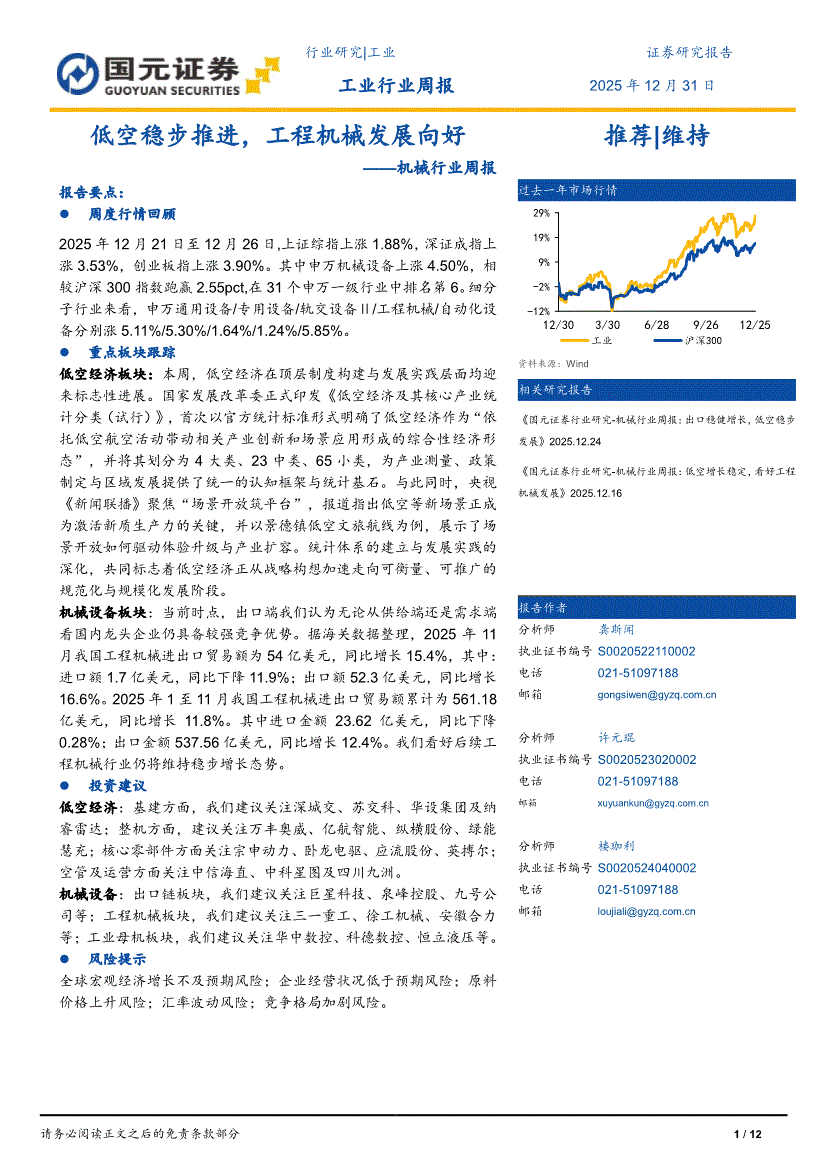 机械行业:国元证券-机械行业周报:低空稳步推进,工程机械发展向好-251231