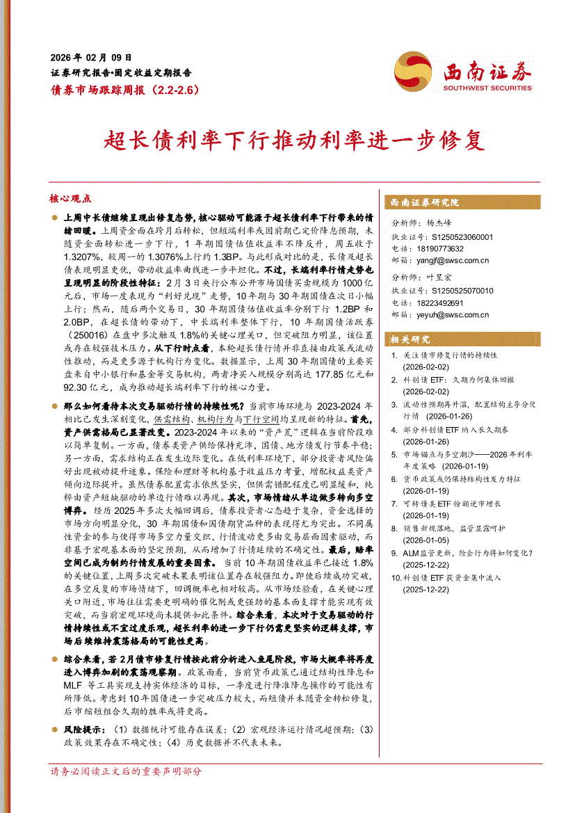 西南证券-债券市场跟踪周报:超长债利率下行推动利率进一步修复-260209