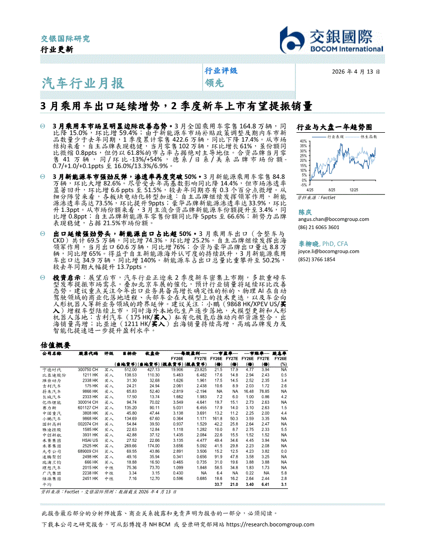 汽车行业:交银国际-汽车行业月报:3月乘用车出口延续增势,2季度新车上市有望提振销量-260413