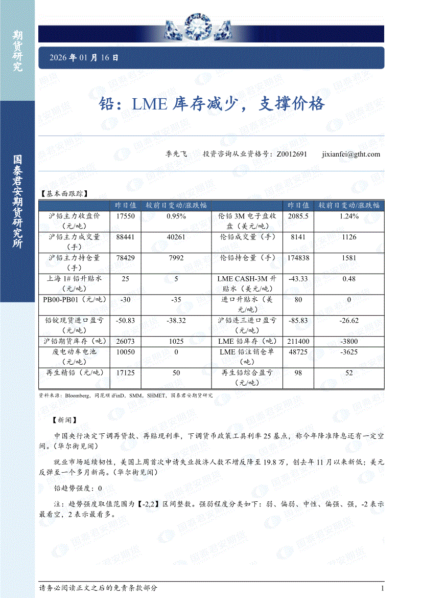 国泰君安期货-铅:LME库存减少,支撑价格-260116