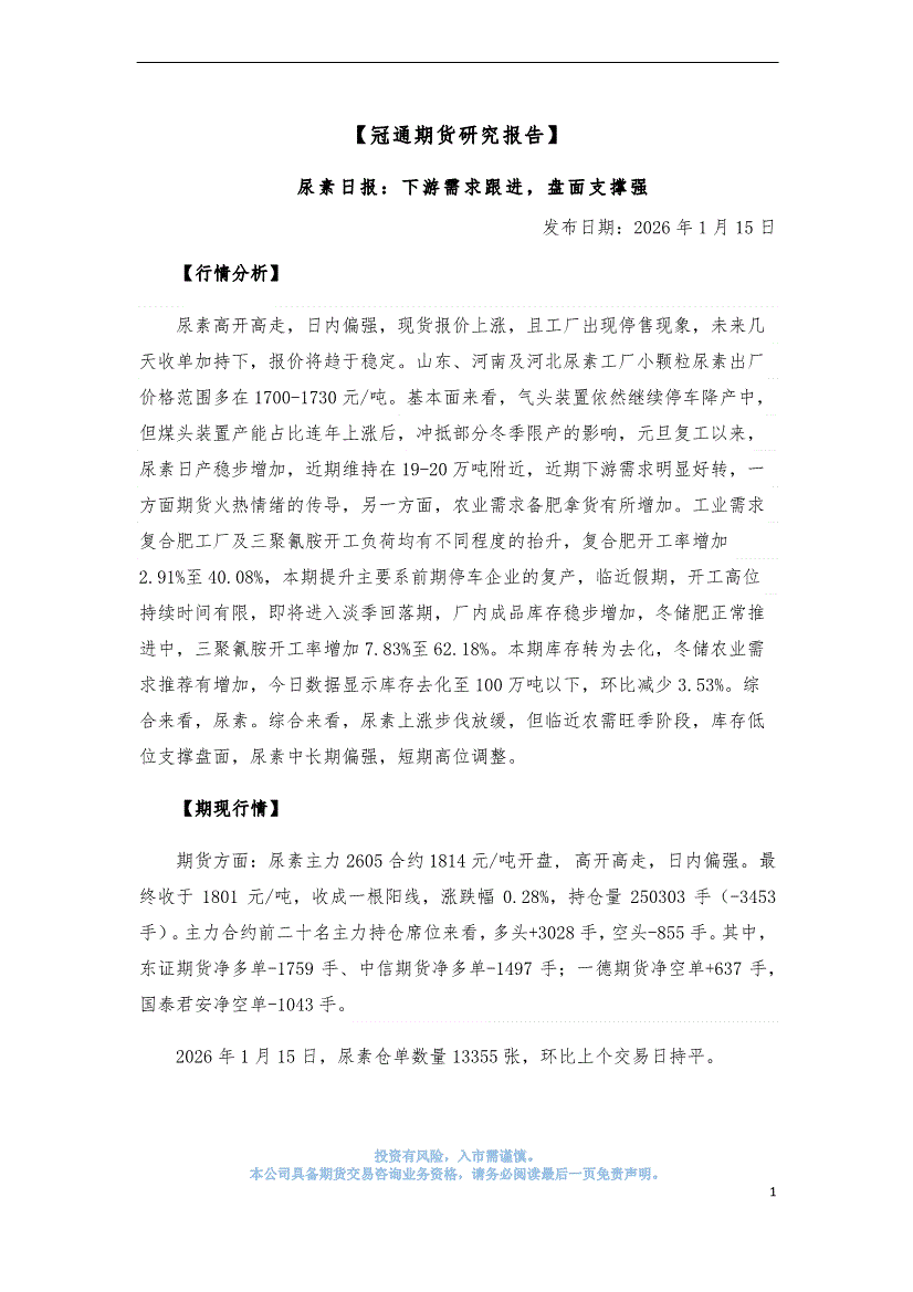 冠通期货-尿素日报:下游需求跟进,盘面支撑强-260115