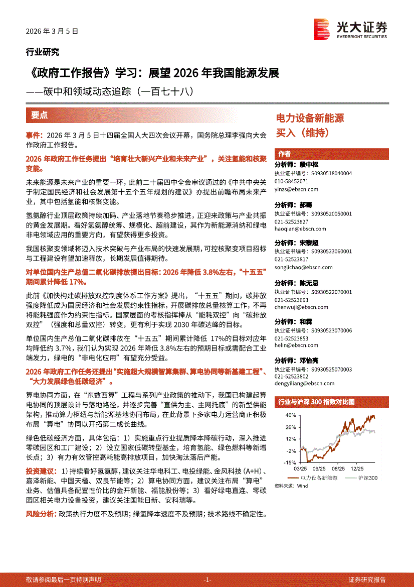 电力设备新能源行业:光大证券-电力设备新能源行业碳中和领域动态追踪(一百七十八):《政府工作报告》学习,展望2026年我国能源发展-260305