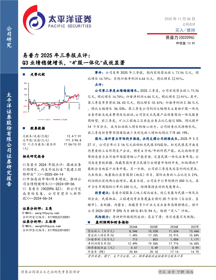 易普力:太平洋证券-易普力-002096-2025年三季报点评:Q3业绩稳健增长,“矿服一体化”成效显著-251106