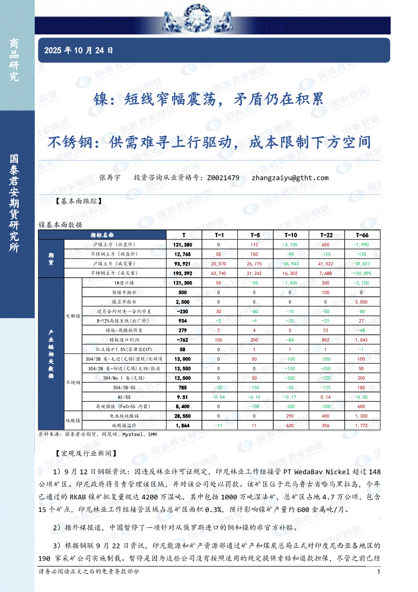 国泰君安期货-镍:短线窄幅震荡,矛盾仍在积累,不锈钢,供需难寻上行驱动,成本限制下方空间-251020