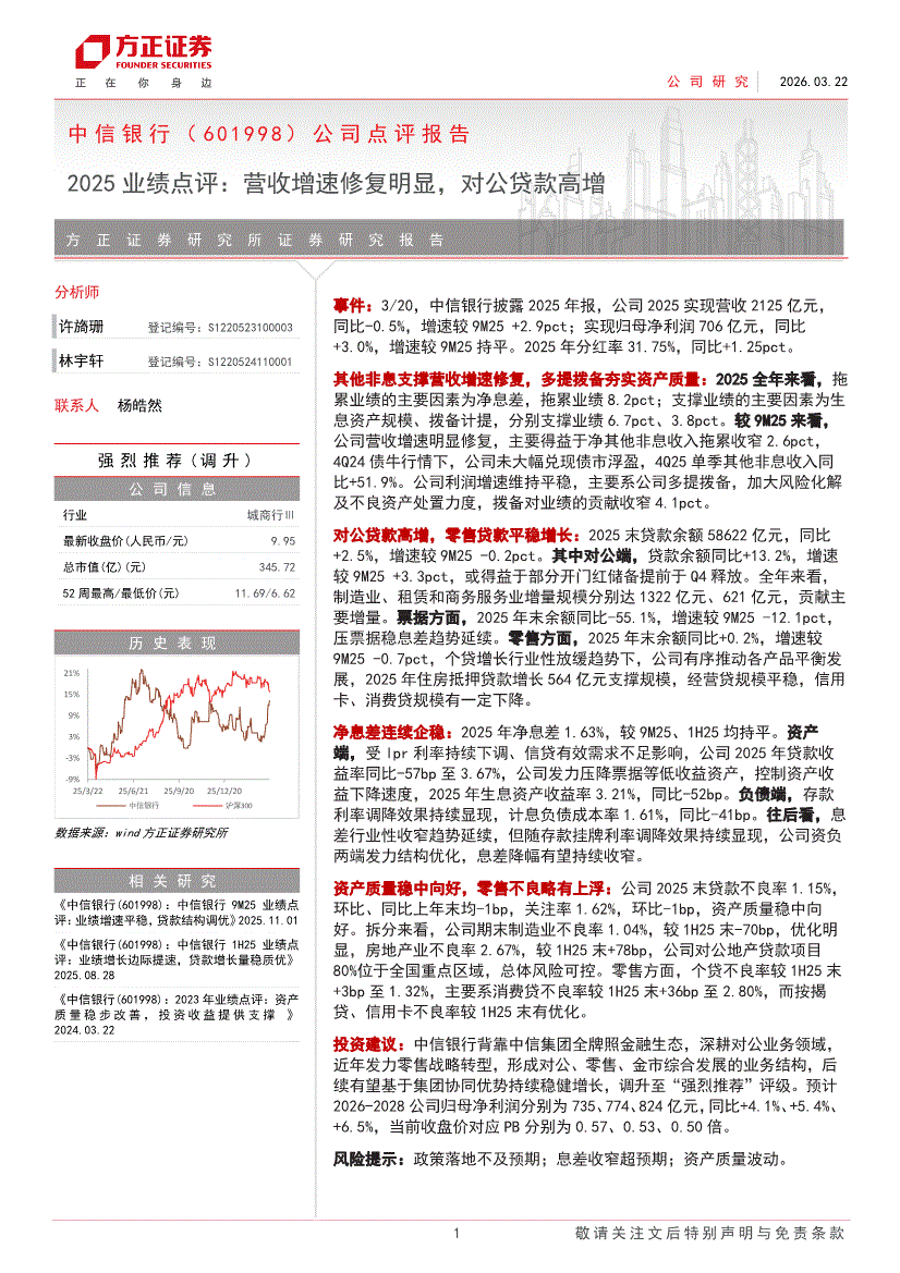 中信银行:方正证券-中信银行-601998-2025业绩点评:营收增速修复明显,对公贷款高增-260322