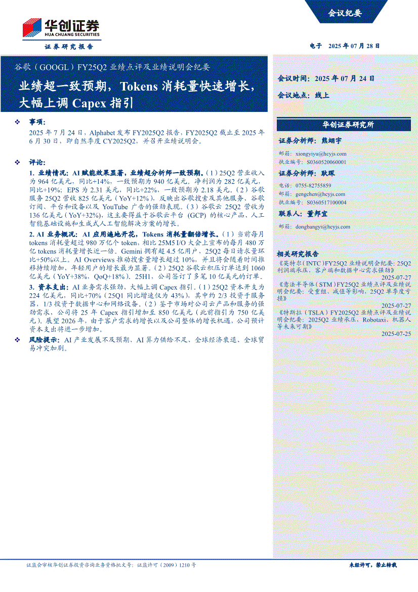 谷歌:华创证券-谷歌-GOOGL.US-FY25Q2业绩点评及业绩说明会纪要:业绩超一致预期,Tokens消耗量快速增长,大幅上调Capex指引-250728