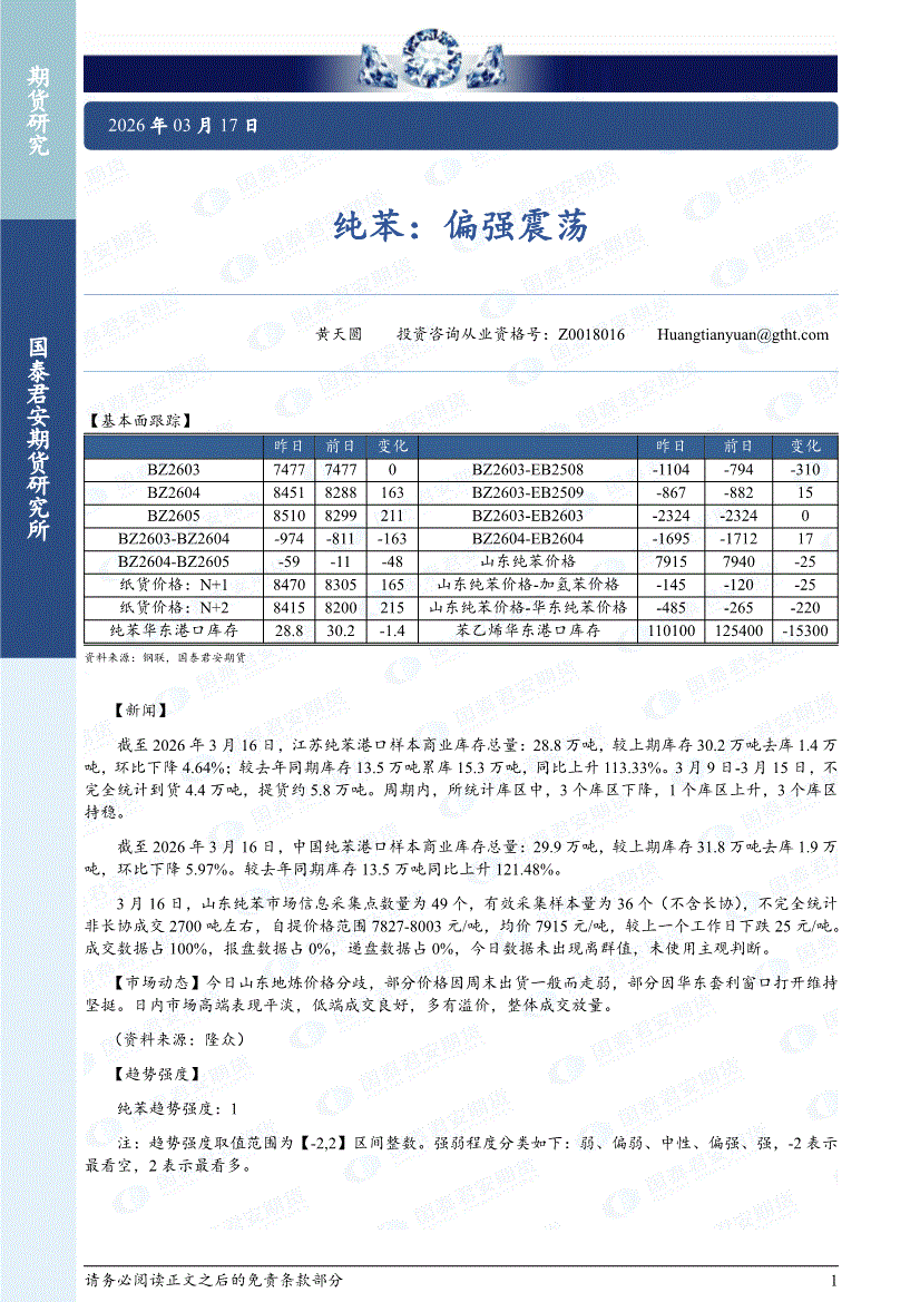 国泰君安期货-苯乙烯:偏强震荡-260318
