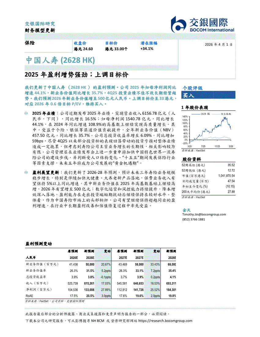 中国人寿:交银国际-中国人寿-2628.HK-2025年盈利增势强劲;上调目标价-260401