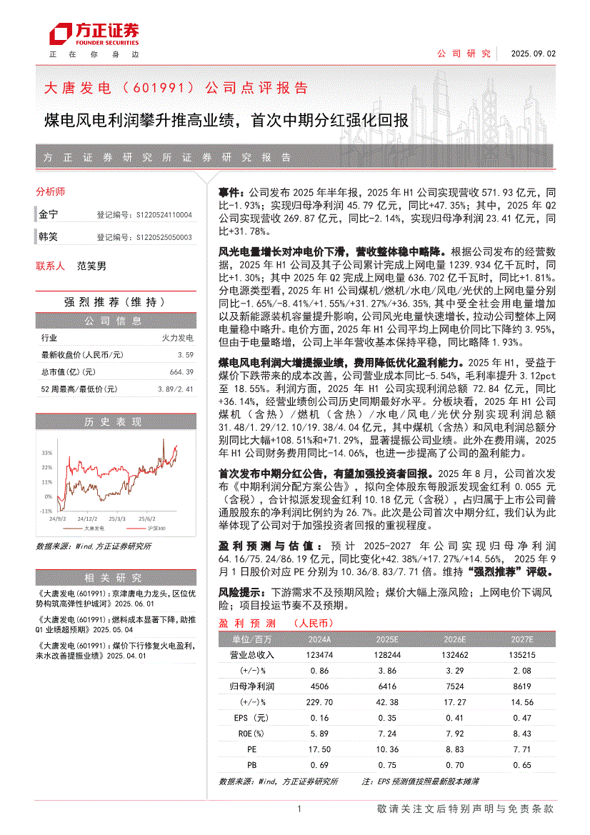 大唐发电:方正证券-大唐发电-601991-公司点评报告:煤电风电利润攀升推高业绩,首次中期分红强化回报-250902
