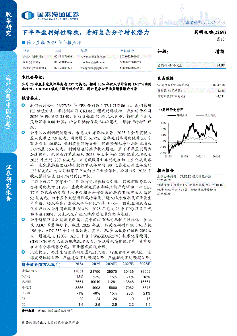 药明生物:国泰海通证券-药明生物-2269.HK-2025年年报点评:下半年盈利弹性释放,看好复杂分子增长潜力-260405