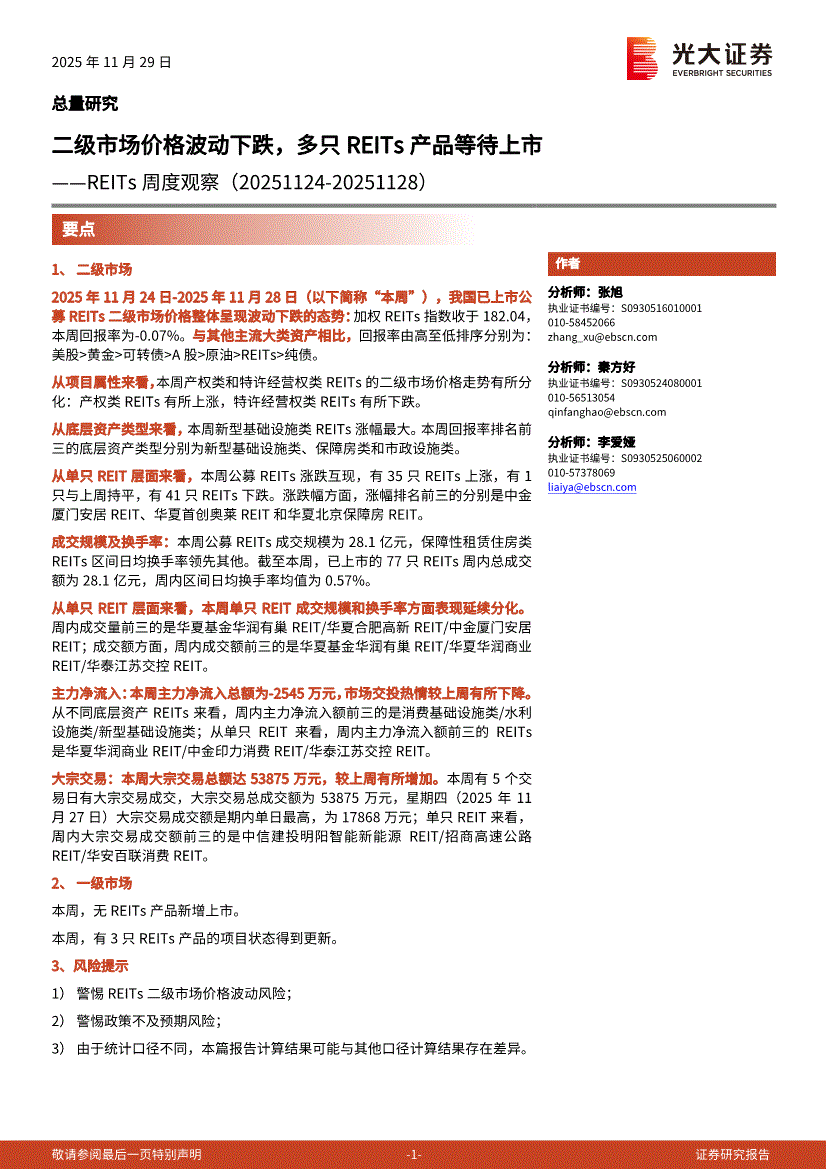 光大证券-REITs周度观察:二级市场价格波动下跌,多只REITs产品等待上市-251129