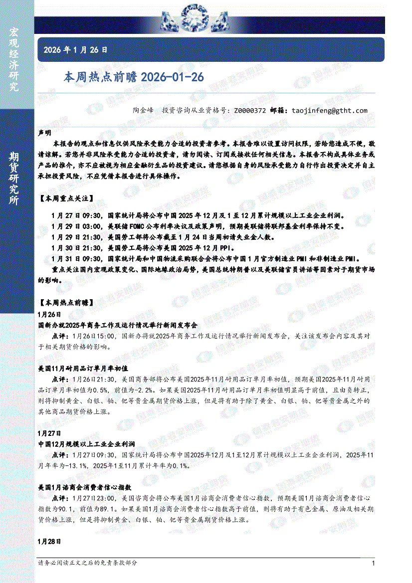 国泰君安期货-股指期货将震荡整理,黄金期货价格再创历史新高,黄金、白银期货将震荡偏强-260129