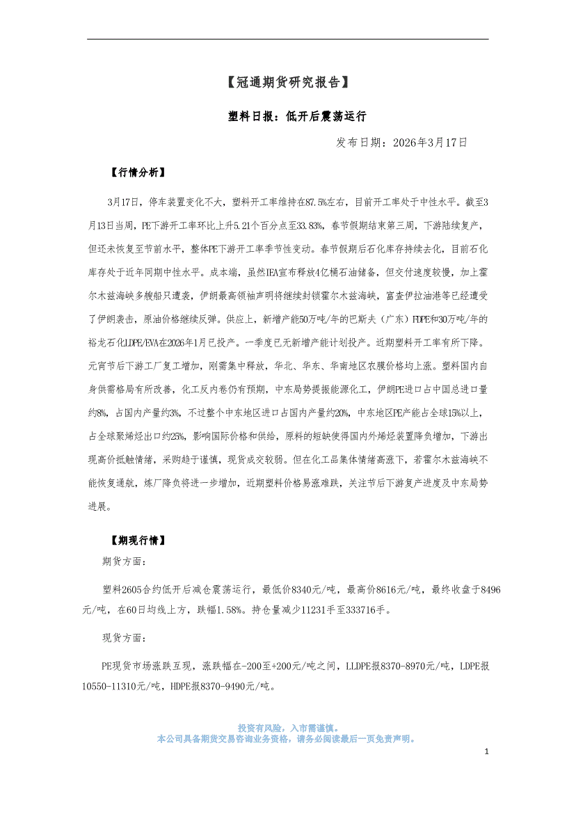 冠通期货-塑料日报:低开后震荡运行-260317