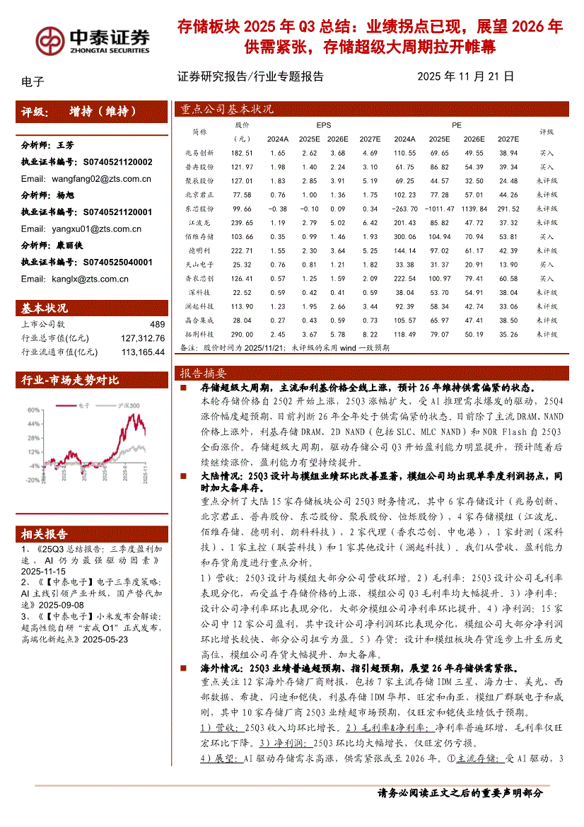 电子行业:中泰证券-电子行业存储板块2025Q3总结:业绩拐点已现,展望2026年供需紧张,存储超级大周期拉开帷幕-251121