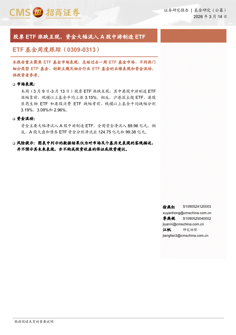 招商证券-ETF基金周度跟踪:股票ETF涨跌互现,资金大幅流入A股中游制造ETF-260314