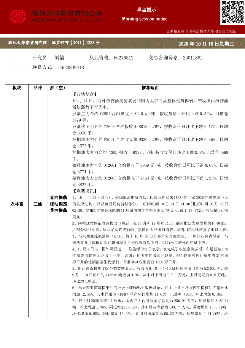 格林大华期货-市场快讯:阿根廷冲击,油粕齐跌-250923