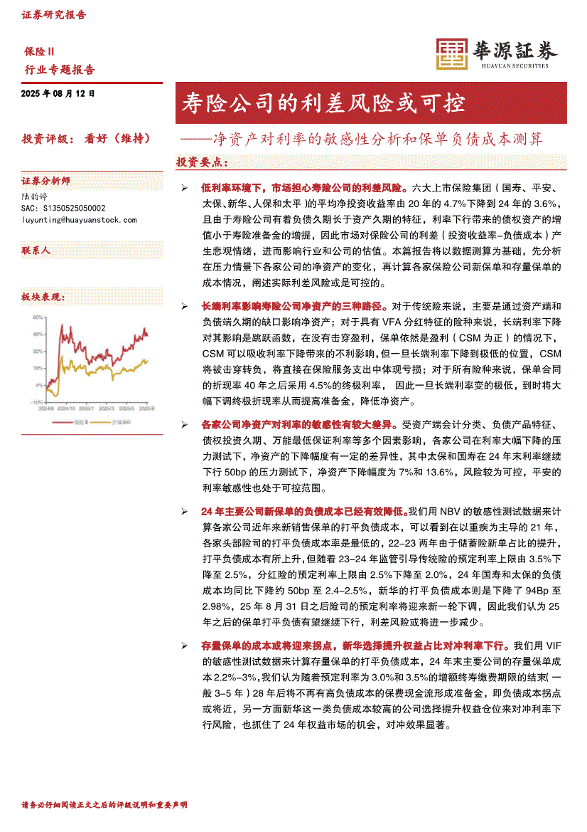 保险行业:华源证券-保险行业:寿险公司的利差风险或可控——净资产对利率的敏感性分析和保单负债成本测算-250812