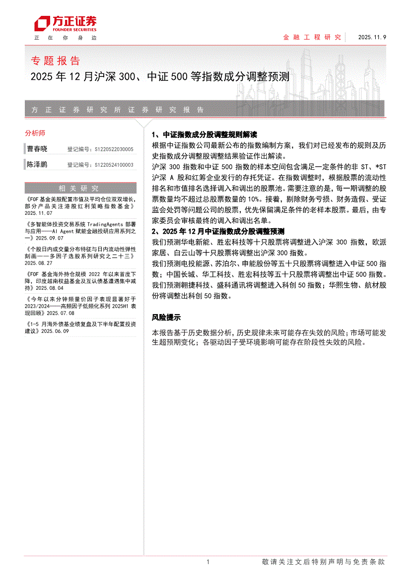 方正证券-专题报告:2025年12月沪深300、中证500等指数成分调整预测-251109