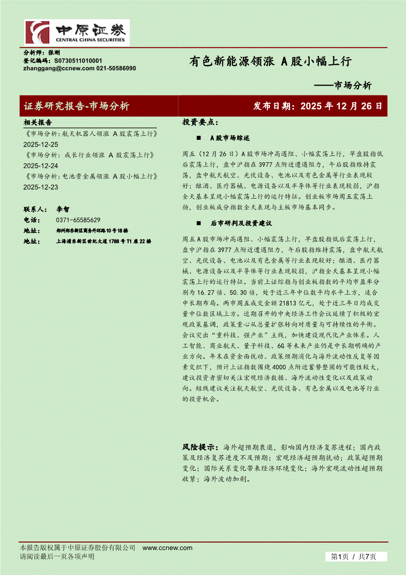 中原证券-市场分析:有色新能源领涨,A股小幅上行-251226