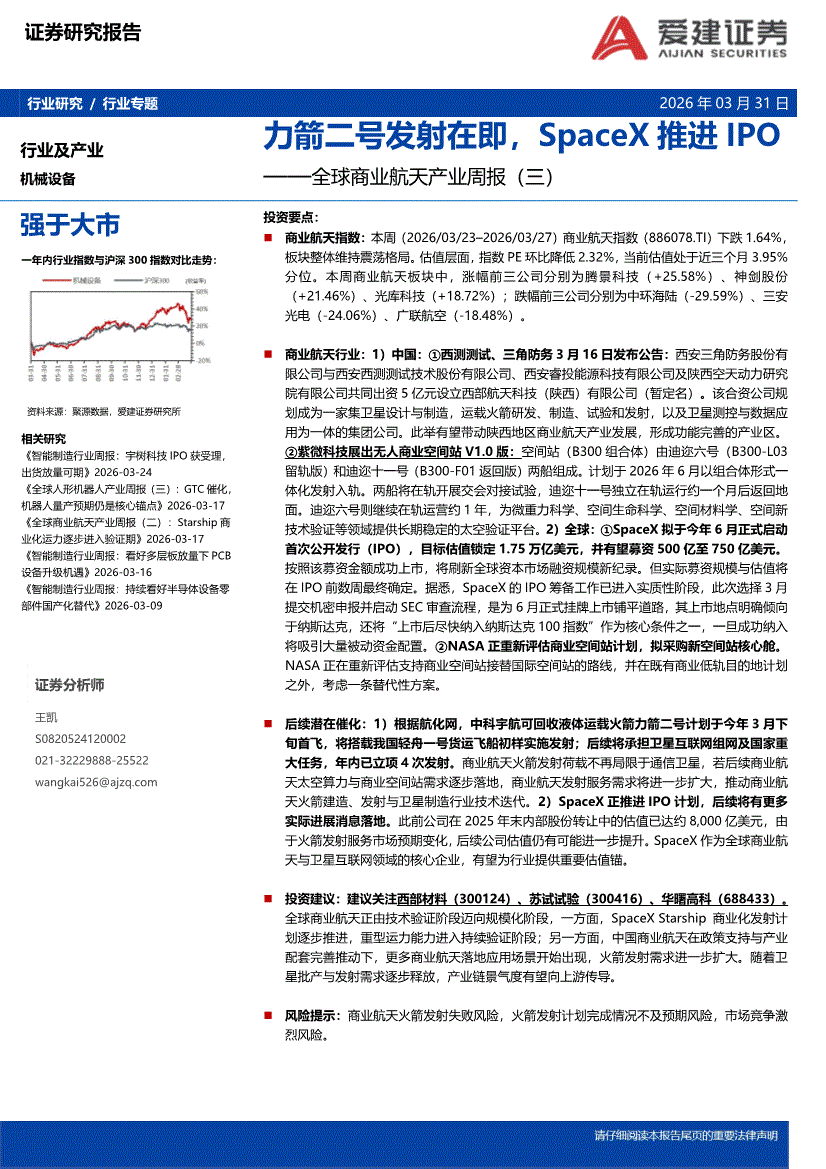 机械设备行业:爱建证券-机械设备行业全球商业航天产业周报(三):力箭二号发射在即,SpaceX推进IPO-260331