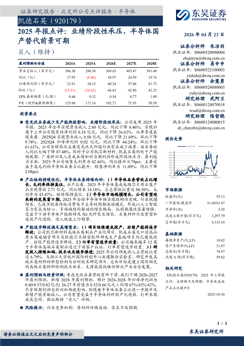 凯德石英:东吴证券-凯德石英-920179-2025年报点评:业绩阶段性承压,半导体国产替代前景可期-260423