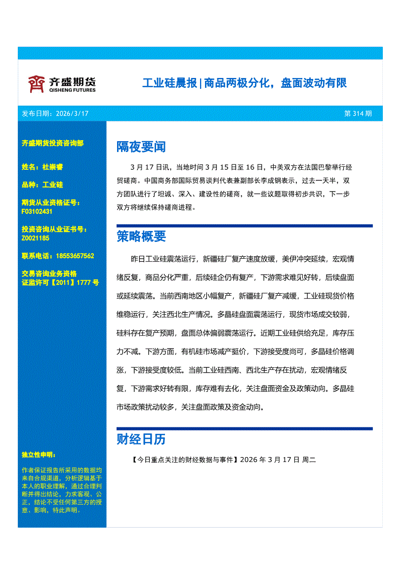 齐盛期货-工业硅晨报:商品两极分化,盘面波动有限-260317