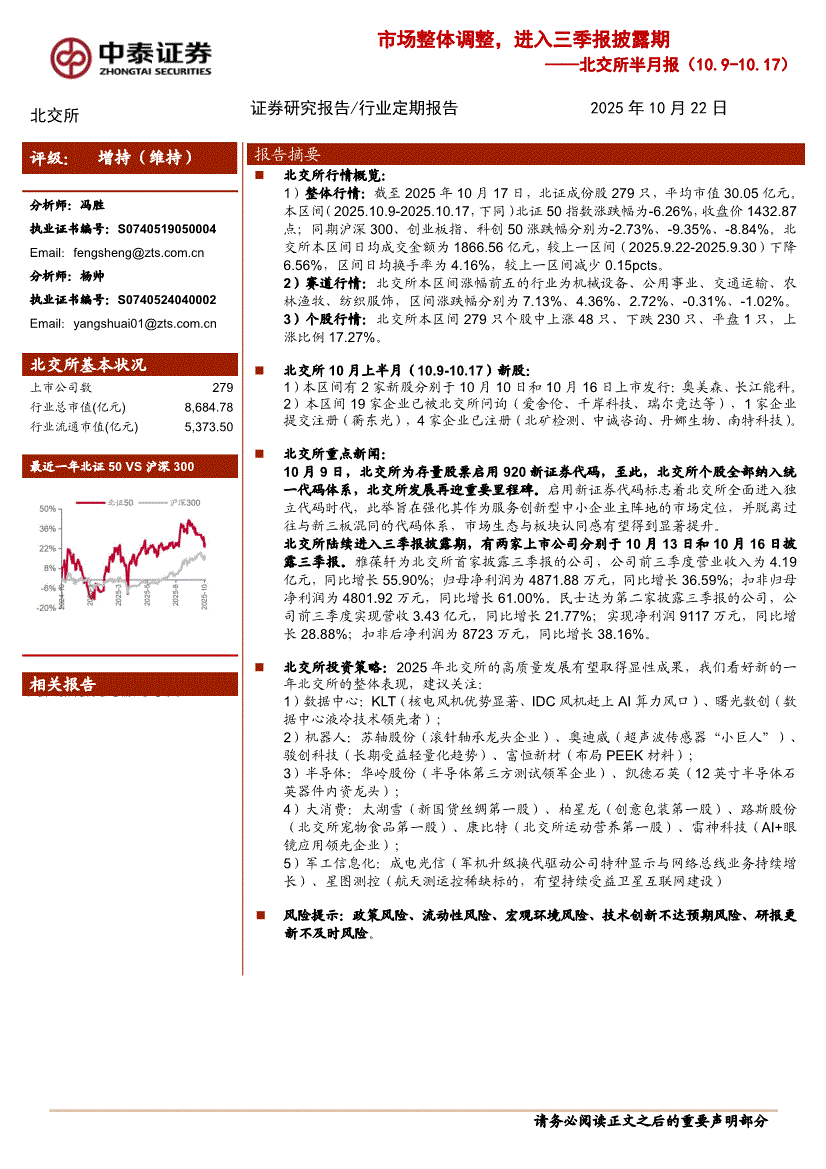 中泰证券-北交所半月报(10.9~10.17):市场整体调整,进入三季报披露期-251022