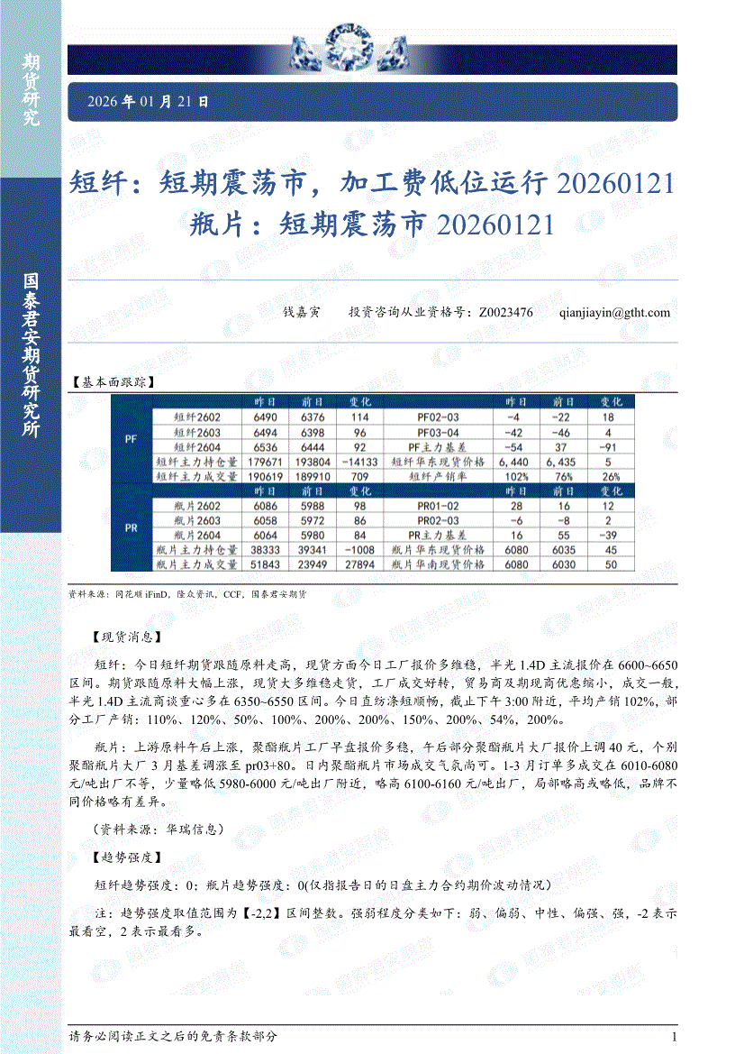 国泰君安期货-短纤:短期趋势偏强,瓶片,短期趋势偏强-260123