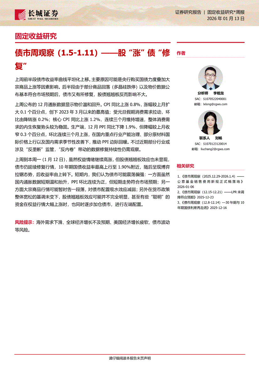 长城证券-债市周观察:股“涨”债“修复”-260113