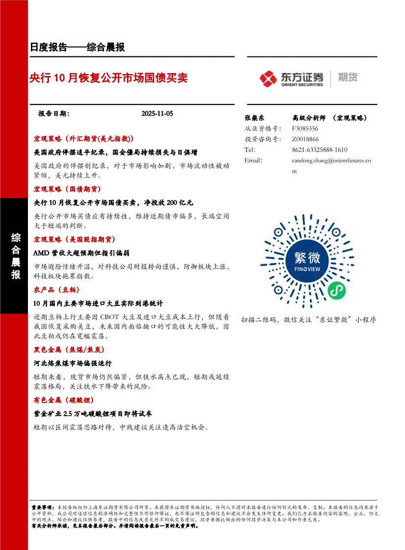 东证期货-综合晨报:央行10月恢复公开市场国债买卖-251105
