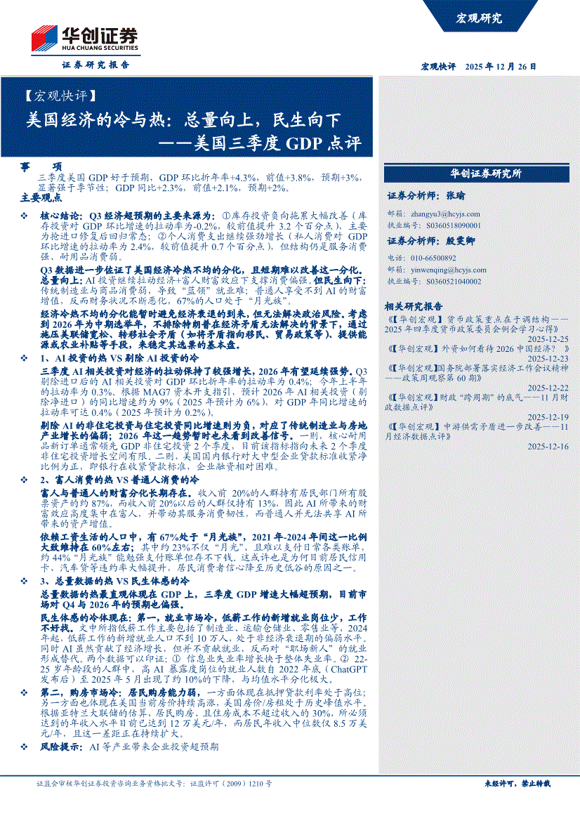 华创证券-【宏观快评】美国三季度GDP点评:美国经济的冷与热,总量向上,民生向下-251226