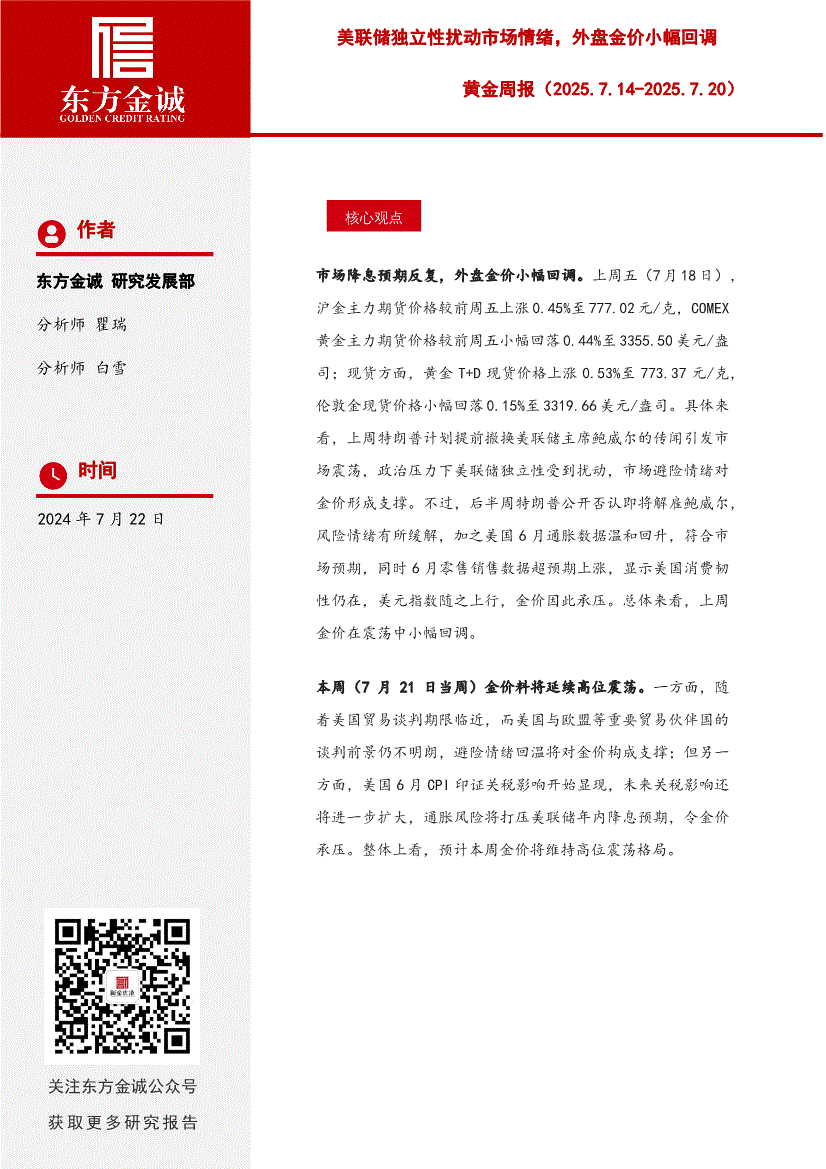 东方金诚-黄金周报:美联储独立性扰动市场情绪,外盘金价小幅回调-250722
