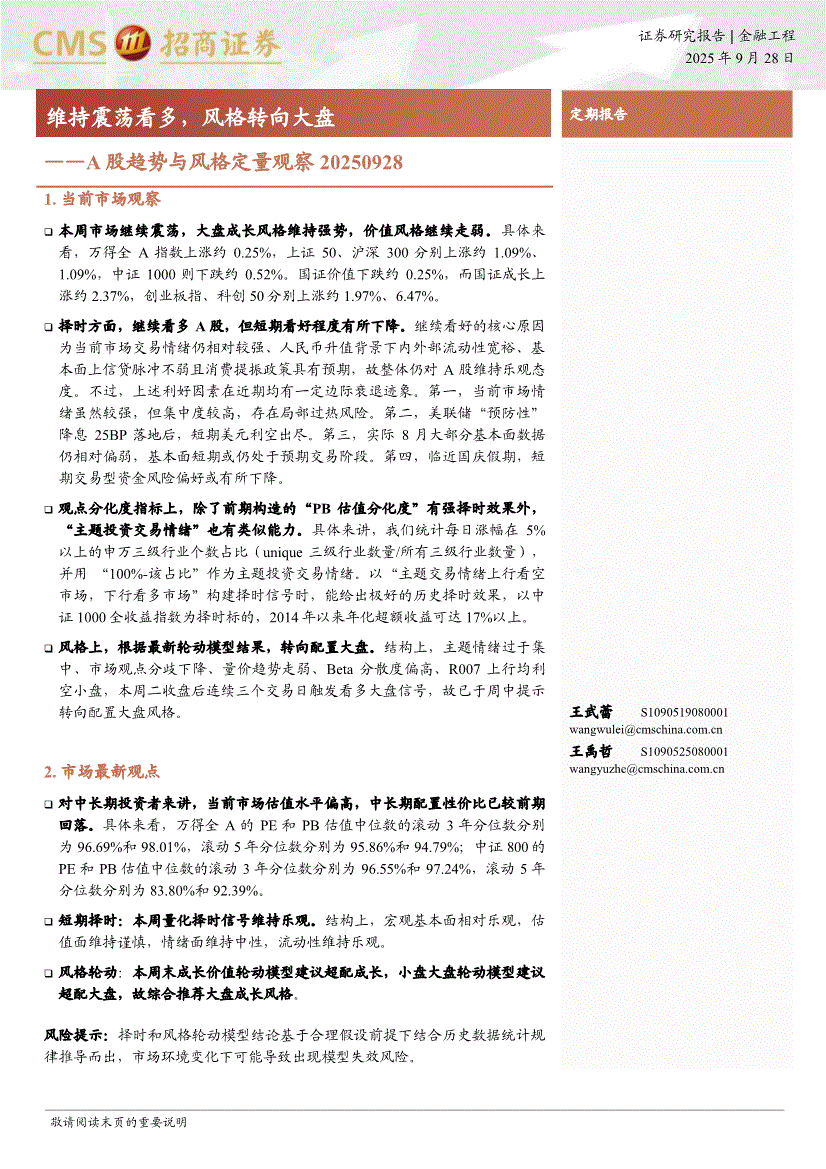 招商证券-A股趋势与风格定量观察:维持震荡看多,风格转向大盘-250928