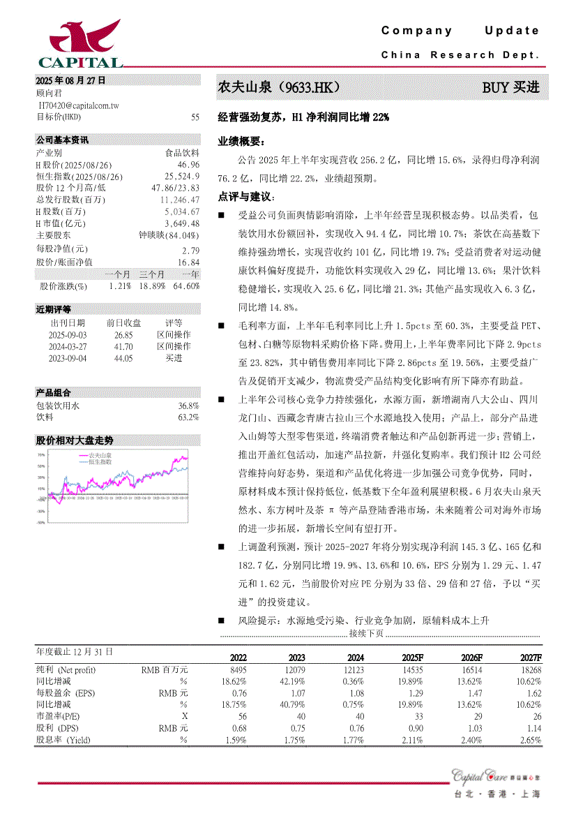 农夫山泉:群益证券(香港)-农夫山泉-9633.HK-经营强劲复苏,H1净利润同比增22% -250827