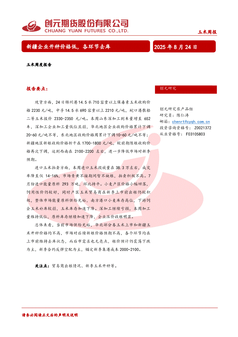 创元期货-玉米周度报告:新疆企业开秤价格低,各环节去库-250824