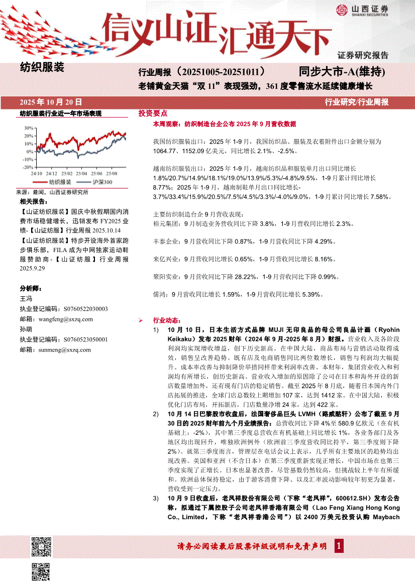 纺织服装行业:山西证券-纺织服装行业周报:老铺黄金天猫“双11”表现强劲,361度零售流水延续健康增长-251020