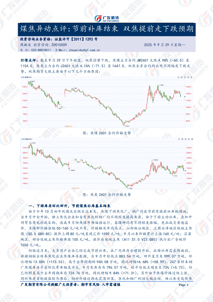 广发期货-煤焦异动点评:节前补库结束,双焦提前走下跌预期-250929