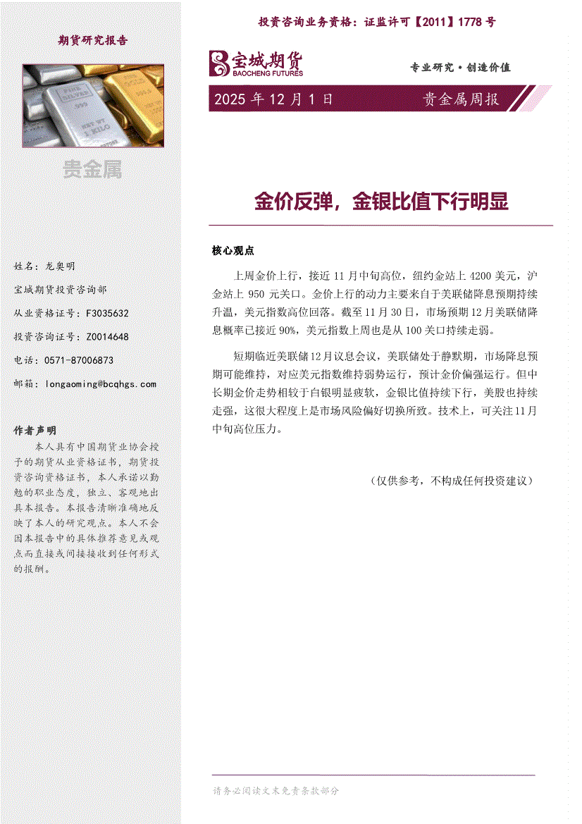 宝城期货-贵金属周报:金价反弹,金银比值下行明显-251201