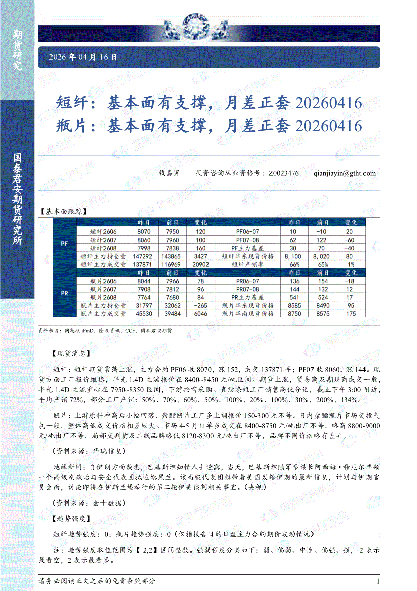 国泰君安期货-短纤:基本面有支撑,月差正套,瓶片,基本面有支撑,月差正套-260416