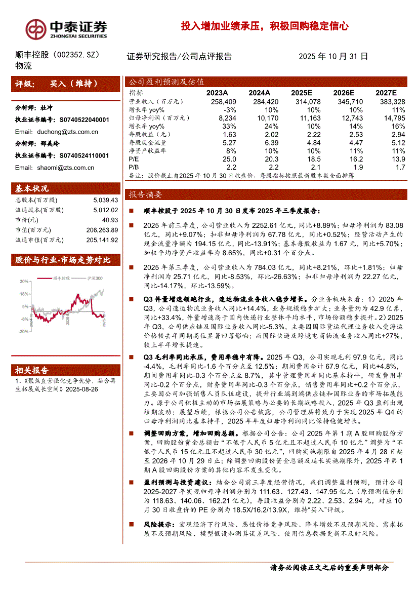 顺丰控股:中泰证券-顺丰控股-002352-投入增加业绩承压,积极回购稳定信心-251031