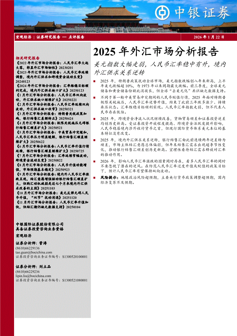 中银国际-2025年外汇市场分析报告:美元指数大幅走弱,人民币汇率稳中有升,境内外汇供求关系逆转-260122