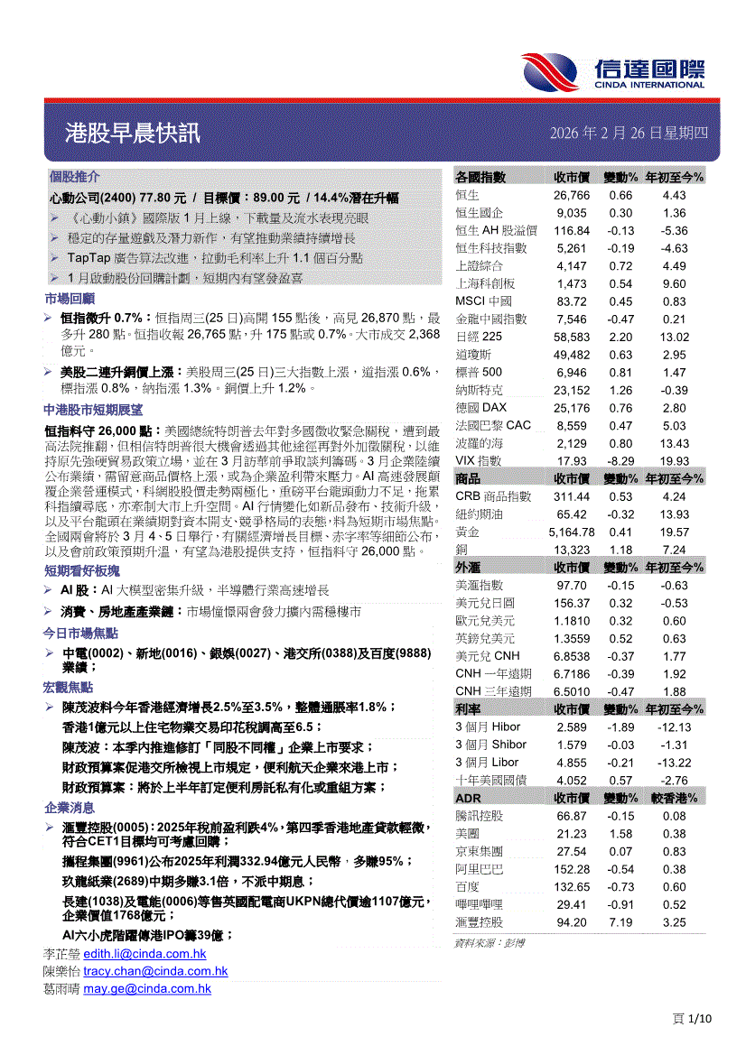 信达国际-港股早晨快讯-260226