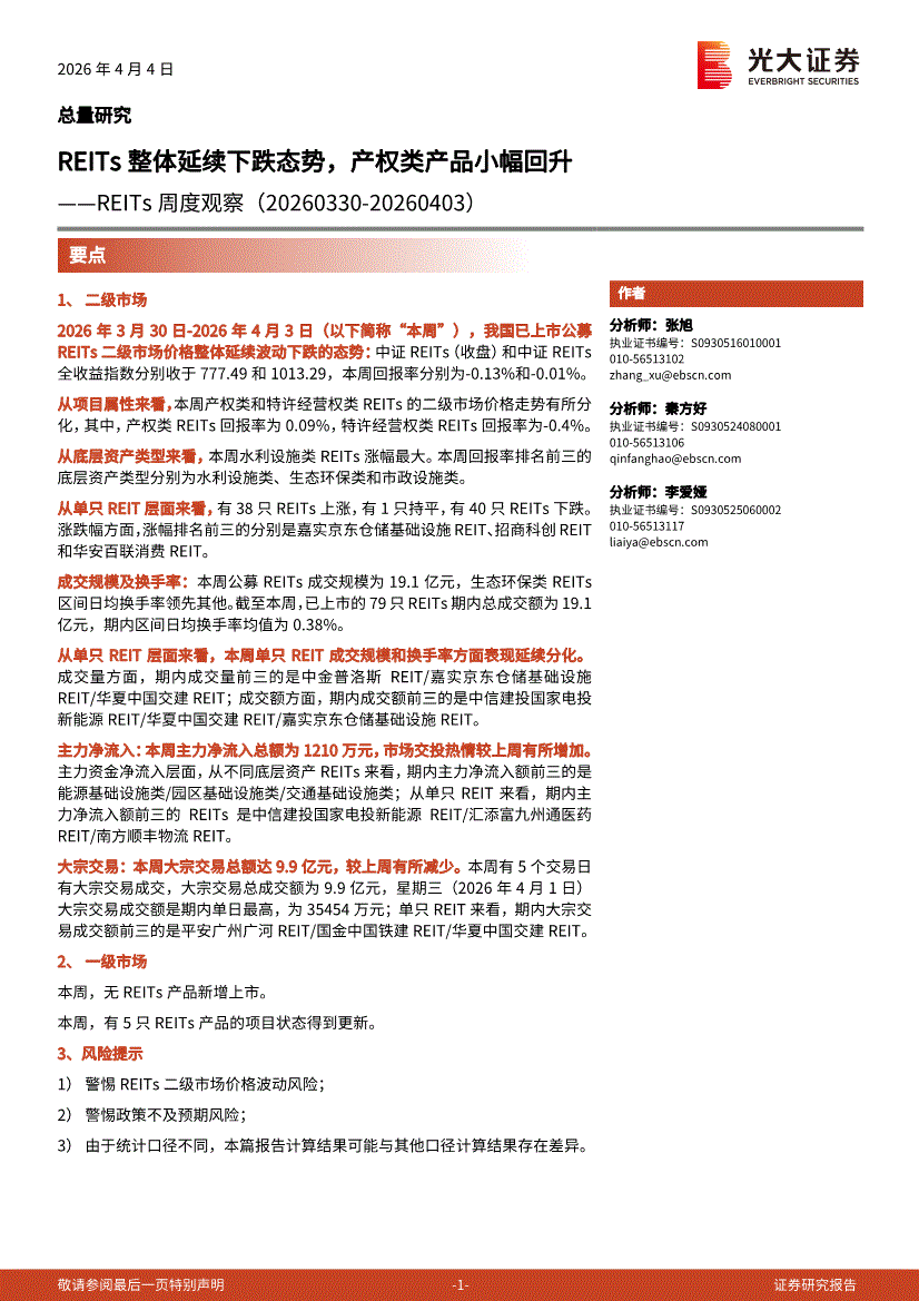 光大证券-REITs周度观察:REITs整体延续下跌态势,产权类产品小幅回升-260404
