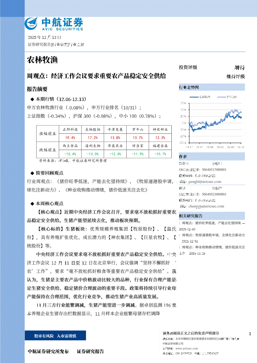 农林牧渔行业:中航证券-农林牧渔行业周观点:经济工作会议要求重要农产品稳定安全供给-251213