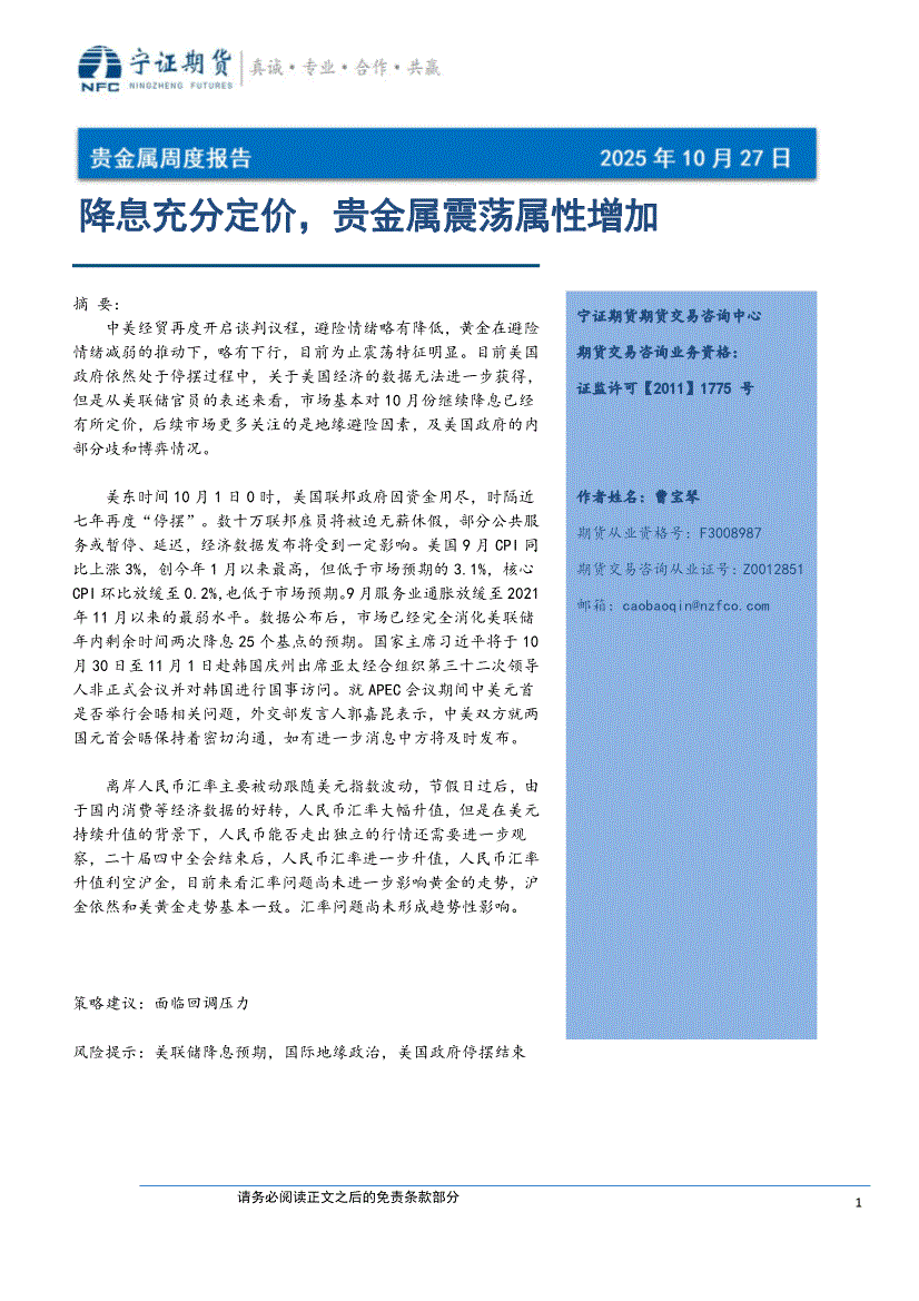 宁证期货-贵金属周度报告:降息充分定价,贵金属震荡属性增加-251027